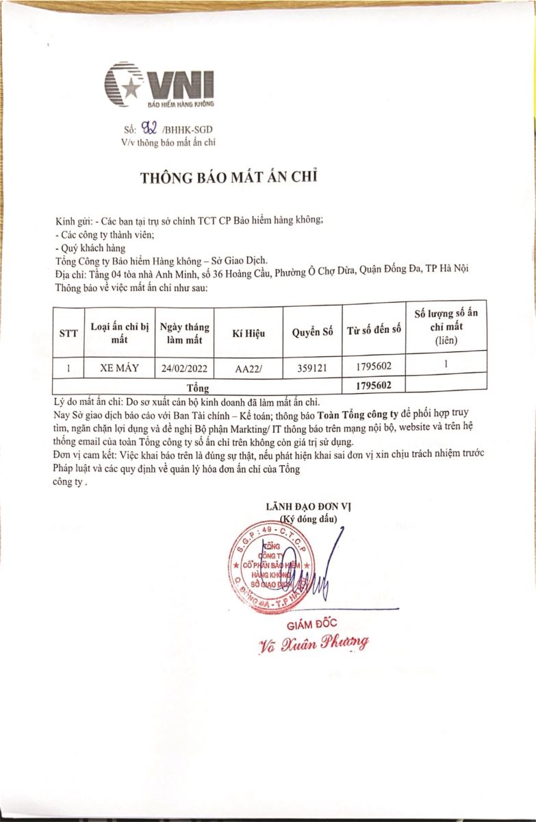 Sở giao dịch thông báo mất ấn chỉ (Số 92)