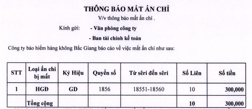 THÔNG BÁO MẤT AC HGĐ VNI BẮC GIANG