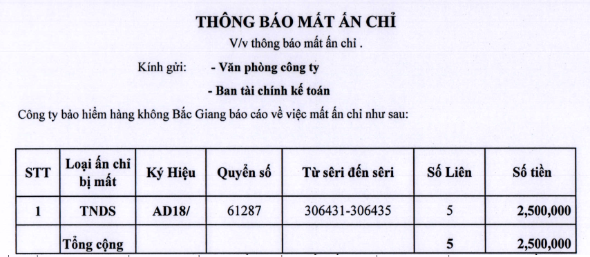 THÔNG BÁO MẤT ẤN CHỈ TNDS XE Ô TÔ - VNI BẮC GIANG