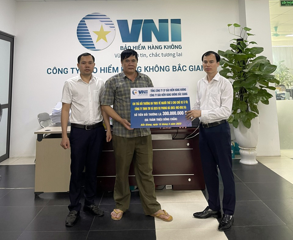 Ngày 15/05/2023 tại Bắc Giang, Công ty Bảo hiểm Hàng không Bắc Giang (VNI Bắc Giang) đã trao bồi thường 300 triệu đồng quyền lợi bảo hiểm TNDS về người thứ ba cho chủ xe ô tô là đại diện Công ty TNHH và DV Phong Hà (BKS: 99C-050.16) đã gây tai nạn giao thông tại Km21 đường QL18 thuộc địa phận thôn Châu Cầu, xã Châu Phong, huyện Quế Võ, tỉnh Bắc Ninh.