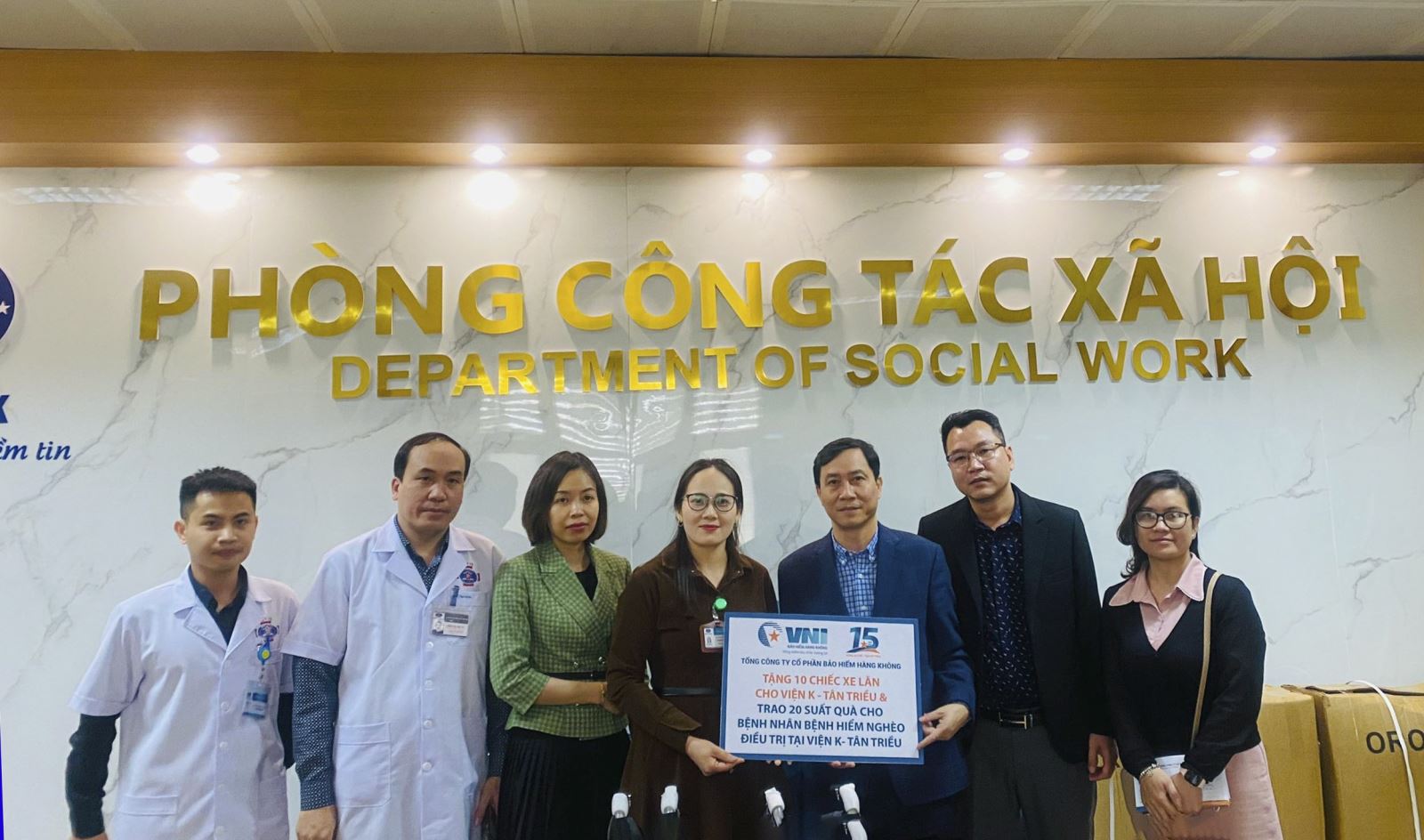 Nằm trong chuỗi hoạt động hướng đến kỷ niệm 15 năm thành lập Tổng công ty cổ phần Bảo hiểm Hàng không (VNI), sáng ngày 3/3/2023, đại diện Ban Lãnh đạo, Công đoàn, Đoàn thanh niên VNI đã tới thăm hỏi, động viên, trao 20 suất quà ý nghĩa đến bệnh nhân mắc bệnh hiểm nghèo có hoàn cảnh khó khăn và trao 10 chiếc xe lăn đến bệnh viện K - Tân Triều.