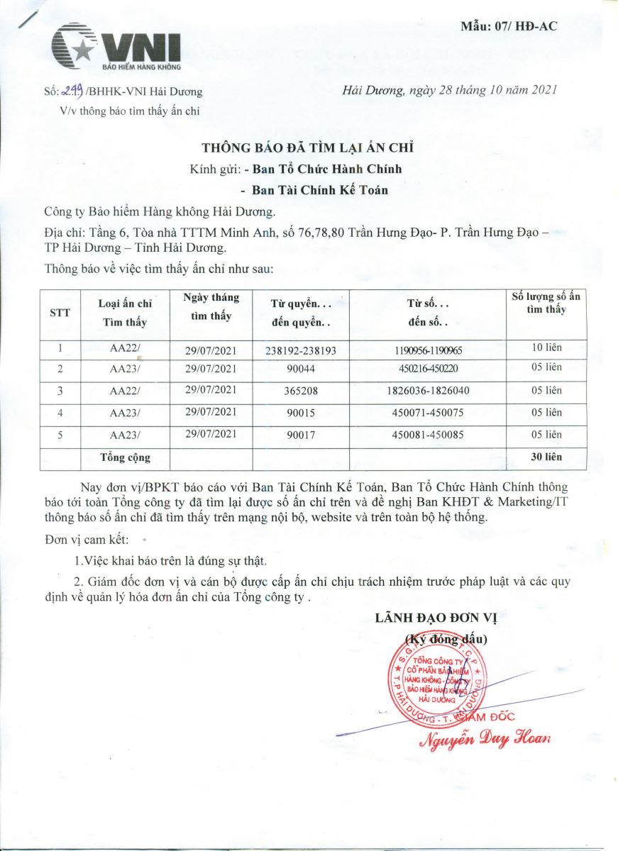 VNI Hải Dương thông báo tìm thấy ấn chỉ (Số 249)