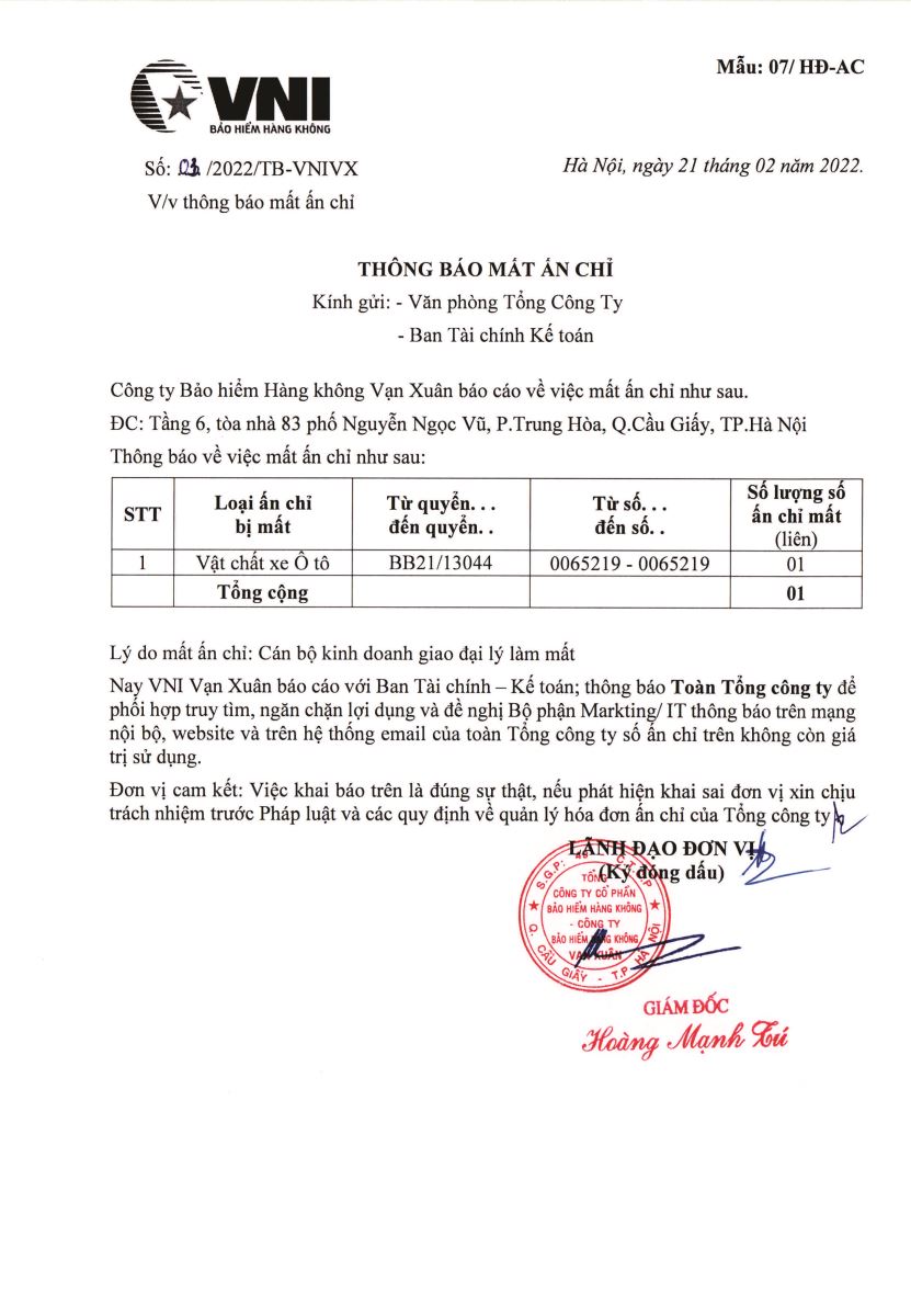 VNI Vạn Xuân thông báo mất ấn chỉ (Số 03)
