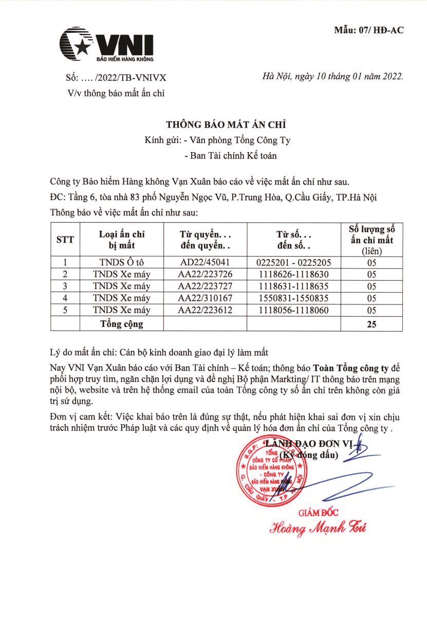 VNI Vạn Xuân thông báo mất ấn chỉ