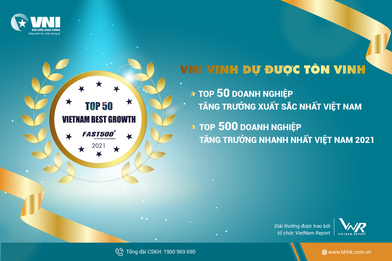 Tổng Công ty Cổ phần Bảo hiểm Hàng không (VNI) vừa vinh dự được tôn vinh Top 50 Doanh nghiệp tăng trưởng xuất sắc nhất Việt Nam (Top 50 Vietnam The Best Growth) và Top 500 Doanh nghiệp tăng trưởng nhanh nhất Việt Nam năm 2021 (FAST 500). Hai giải thưởng này do Công ty Cổ phần Báo cáo Đánh giá Việt Nam - Vietnam Report phối hợp cùng Báo VietNamNet công bố.