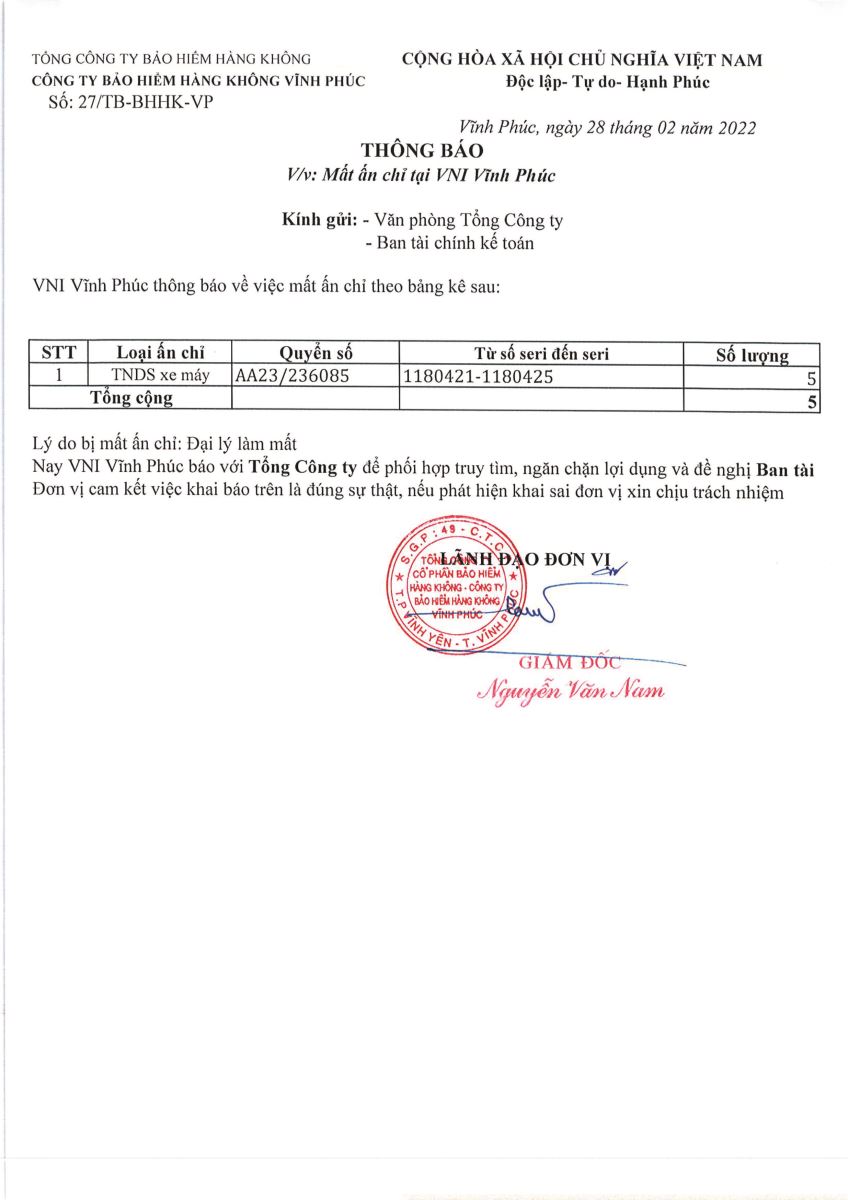 VNI Vĩnh Phúc thông báo mất ấn chỉ (Số 27)