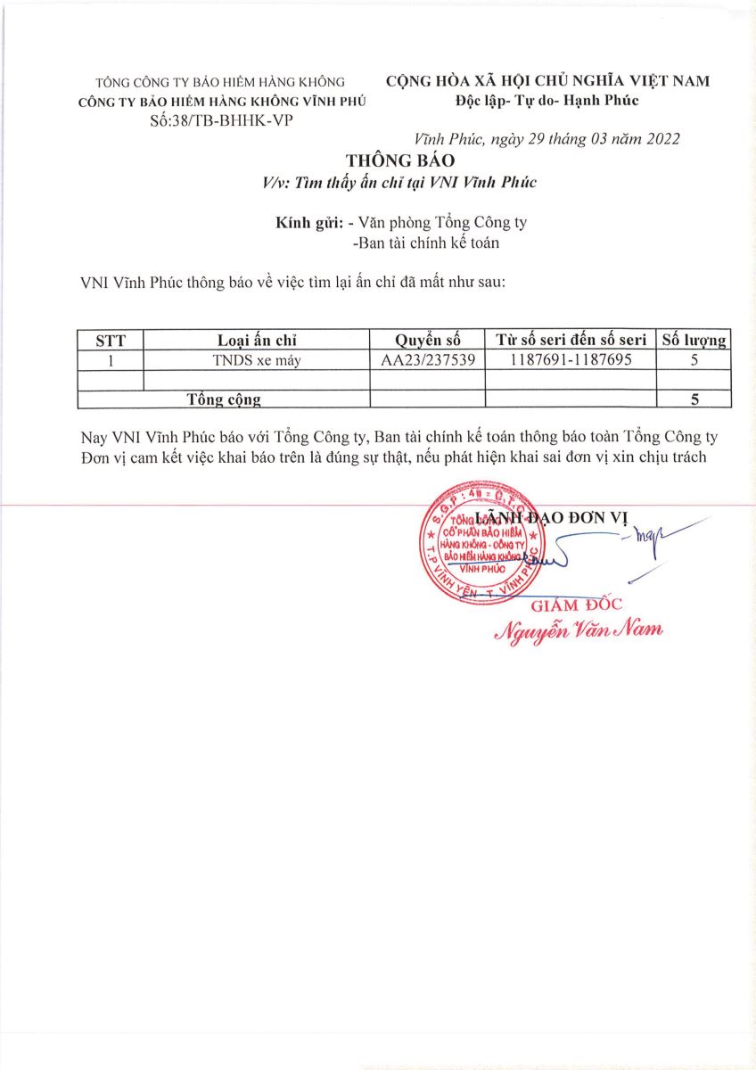 VNI Vĩnh Phúc thông báo tìm thấy ấn chỉ (Số 38, 39, 40)
